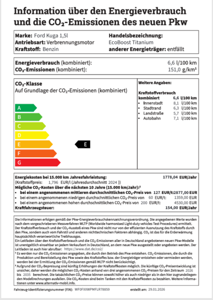 Winter Paket: beheizbare Frontscheibe, Vordersitze individuell und variabel beheizbar, beheizbares Lederlenkrad; Auffahrwarnsysem, Spurhalteassistent,Sprwechsel- Warnsystem, Notbremsassistent, ISOFIX, Verkehrskennzeichenerkennung, Geschwindigkeitsregelanlage, Ford Easy Fuel, Bordcomputer, Nebelscheinwerfer, Kurvenlicht, LED, Tagfahrlicht,